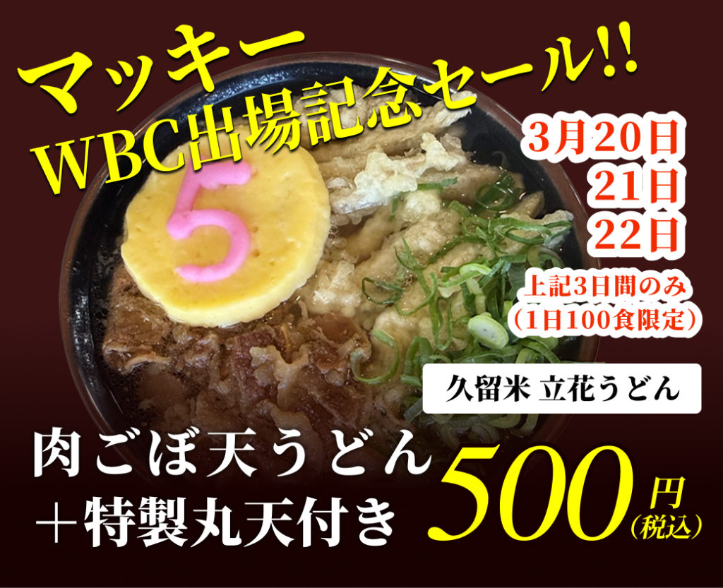 当店一番人気の「肉ごぼ天うどん」に、牧原選手の背番号「5」にちなんだ「特製丸天」を贅沢にトッピング!